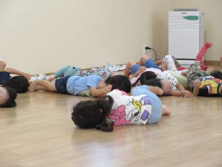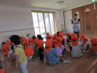 午前中はダンゴムシポーズの練習、災害時の過ごし方の説明を聞きました。