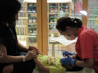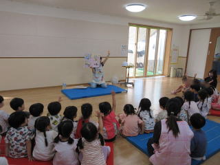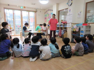 全園児歯科検診です。歯科医より「よく噛んで食べる」「姿勢を正しく」「歯やあごにストレスをかけない」とのお話を伺いました。保育園では毎朝「あいうべ体操」を始め、口回りや舌の筋肉を鍛えています。
