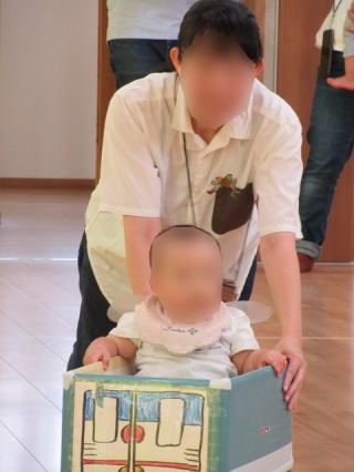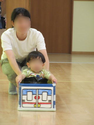 0歳「おひさま組」は朝の会の後、お遊戯、絵本の読み聞かせ、親子でダンボール列車です。